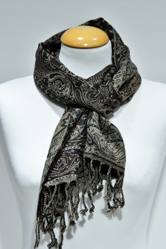 En elegant och varm sjal i 100% ull, perfekt för kyliga dagar. Denna mindre sjal har ett vackert, intrikat mönster i jordnära toner av brunt, svart och guld. Detaljerade vävda mönster i klassisk paisley-stil ger sjalen ett tidlöst och sofistikerat uttryck. Med fransade kanter för en bohemisk touch passar den både till vardag och fest.