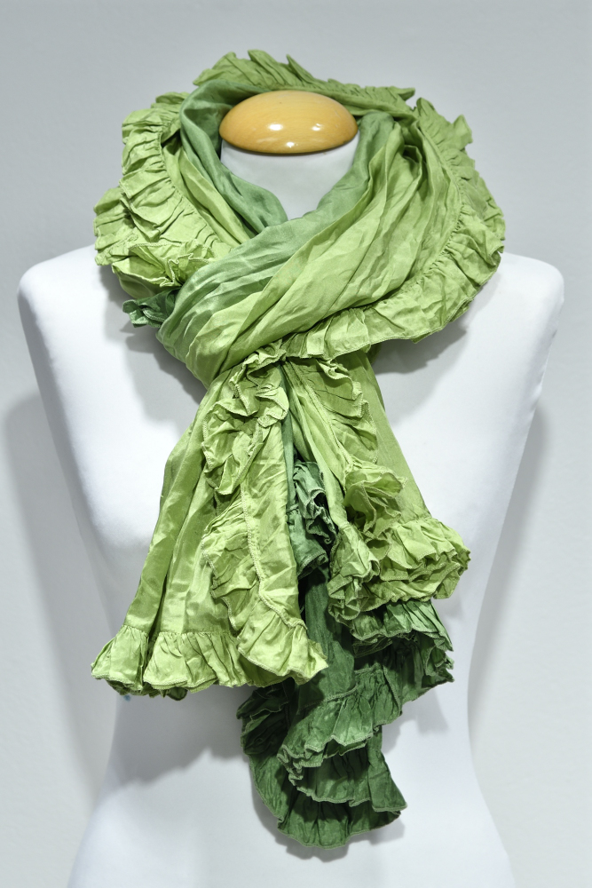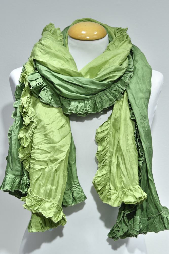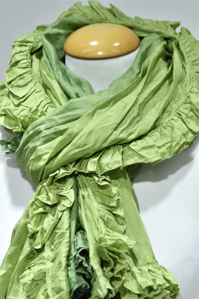 Lyft din outfit med denna vackra gröna sidensjal i 100% siden. Sjalen är mjuk, lätt och följsam, och de dekorativa volangerna längs hela kanten ger ett exklusivt och feminint uttryck utan att vara överdrivet. En vacker detalj att ha över axlarna till en aftonklänning eller runt halsen vid kallare väder.