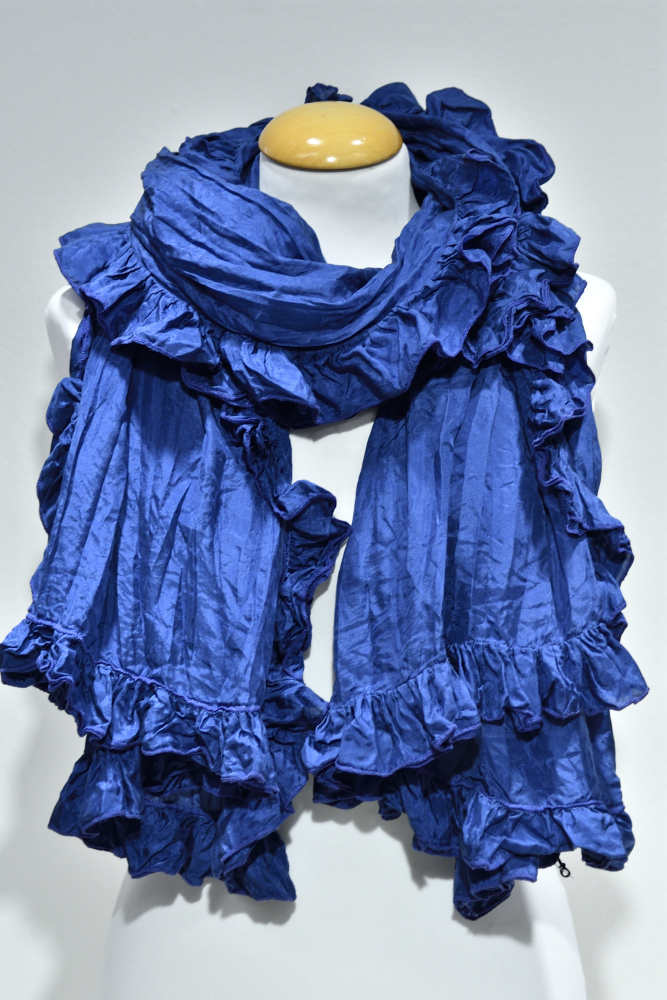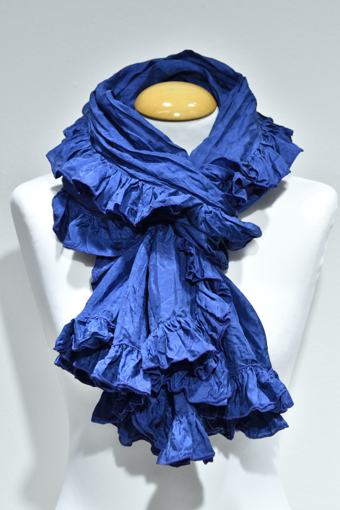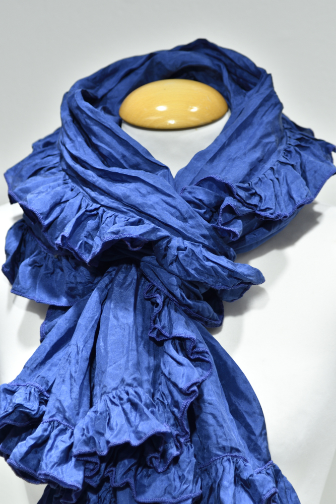Lyft din outfit med denna vackra mörkblå sidensjal i 100% siden. Sjalen är mjuk, lätt och följsam, och de dekorativa volangerna längs hela kanten ger ett exklusivt och feminint uttryck utan att vara överdrivet. En vacker detalj att ha över axlarna till en aftonklänning eller runt halsen vid kallare väder.